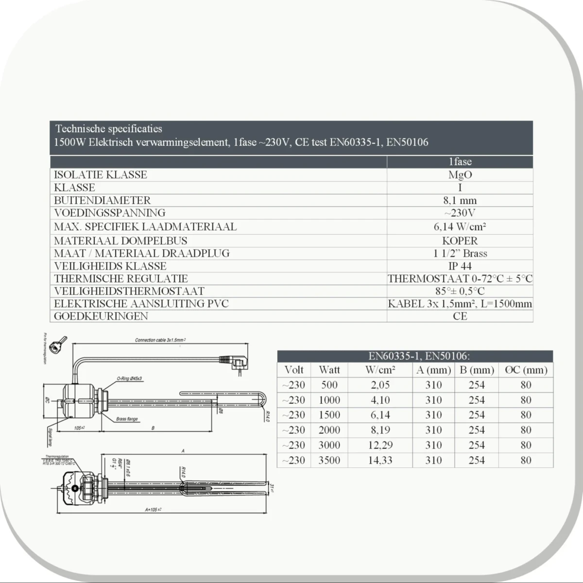 Elektrisch verwarmingselement koper – 1,5 kW 230V met thermostaat