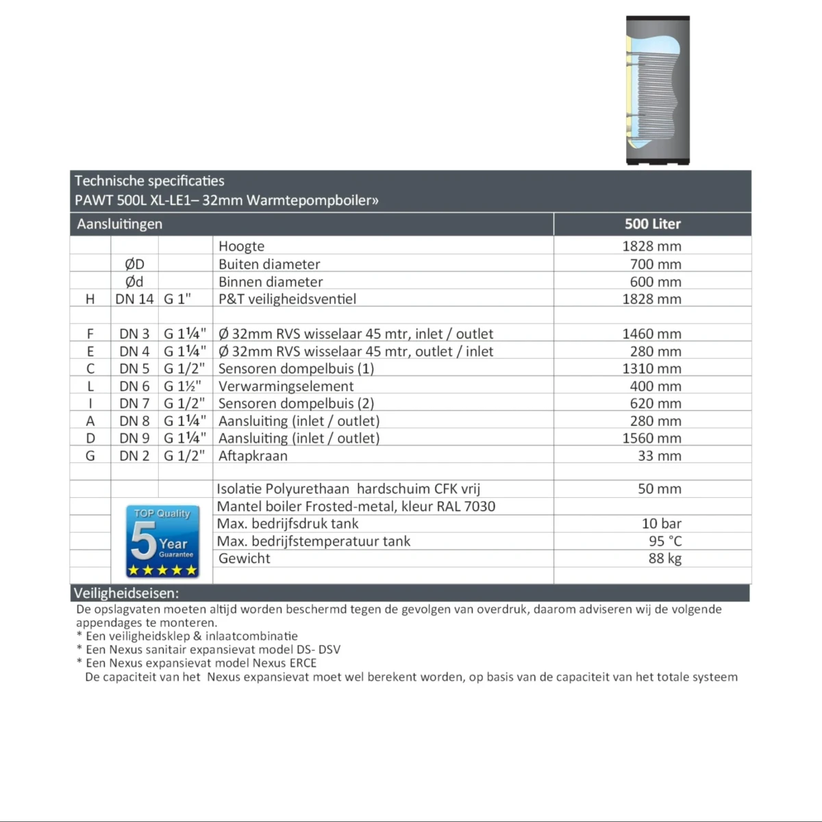 PAWT-500 XL-LE1 – 500 Liter boiler met XL RVS Warmtewisselaar